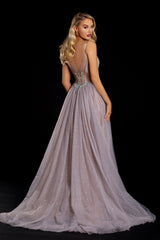 Portia and Scarlett PS21107 is Pageant Evening and Prom Gown Ready. The gown has a corseted vee shaped bodice encrusted with lace and crystal embellishment. The A-line skirt centred with a high leg split made with patterned tulle. The dress is a standard size make with moderate stretch, the model wears size 2 and is 175cm tall wearing 10 cm high heels. Base fabric is Power mesh Body Con overlayed with netting and embellished with a centre back zip.