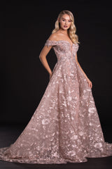 Portia and Scarlett PS21109 is Evening Ready, Embroidered lace overlayed with a rich platinum embellishment and beading, the dress has a fitted inner skirt and a dramatic but flattering overskirt. Designed with an elegant off shoulder strap and modest vee bust line. The dress is a standard size make with moderate stretch, the model wears size 2 and is 175cm tall wearing 10 cm high heels. Base fabric is Power mesh Body Con overlayed with embroidered lace.