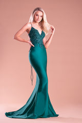 Portia and Scarlett PS21116 Prom Dress is made with our in house manufactured thick stretch lycra fabric, embellished with beaded and encrusted lace paneled down the middle bodice. The dress has a corset tie up back with lave detailing. The dress is a standard size make with more than moderate stretch over the hips and bum, the model wears size 2 and is 175cm tall wearing 10 cm high heels. Base fabric is Portia and Scarlett manufactured Lyrca overlayed with netting and embellished with a centre back zip.