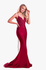 Portia and Scarlett PS21116 Prom Dress is made with our in house manufactured thick stretch lycra fabric, embellished with beaded and encrusted lace panelled down the middle bodice. The dress has a corset tie up back with lave detailing. The dress is a standard size make with more than moderate stretch over the hips and bum, the model wears size 2 and is 175cm tall wearing 10 cm high heels. Base fabric is Portia and Scarlett manufactured Lyrca overlayed with netting and embellished with a centre back zip.