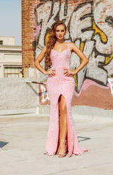 Portia and Scarlett PS21 13 is Prom and Homecoming ready this style has a classic strapped bust line and middle split, its impeccable fit hugs the curves in all the right places. Made with our signature power mesh it is inner boned and cupped with an ab velvet sequin. The dress is a standard size make with moderate stretch, the model wears size 2 and is 175cm tall wearing 1 cm high heels.