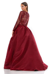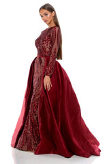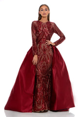 The 1705 Long Sleeves is a patterned sequin gown, paired with a stylish detachable overskirt. It is a high front, high back, long sleeve gown, which comes with an overskirt. The overskirt is in a thick, plain satin fabric. The dress is lined but has sheer sleeves.
