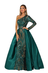 The 1705 One Shoulder is a patterned sequin gown, paired with a stylish detachable overskirt. It is a high front, high back, long sleeve gown, which comes with an overskirt. The overskirt is in a thick, plain satin fabric. The dress is lined but has sheer sleeves.