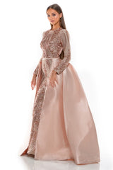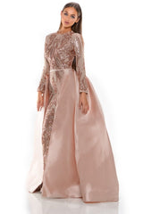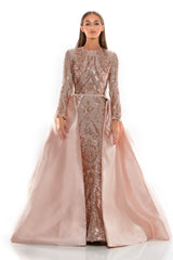 The 1705 Long Sleeves is a patterned sequin gown, paired with a stylish detachable overskirt. It is a high front, high back, long sleeve gown, which comes with an overskirt. The overskirt is in a thick, plain satin fabric. The dress is lined but has sheer sleeves.