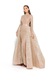 The 1702 long sleeves is an all glitter gown, paired with a stylish detachable overskirt in glitter fabric. Its classic mermaid fit with a boned bodice, accentuates the body?? features and curves. It has a high collared neck line with a high back, with an invisible zip.